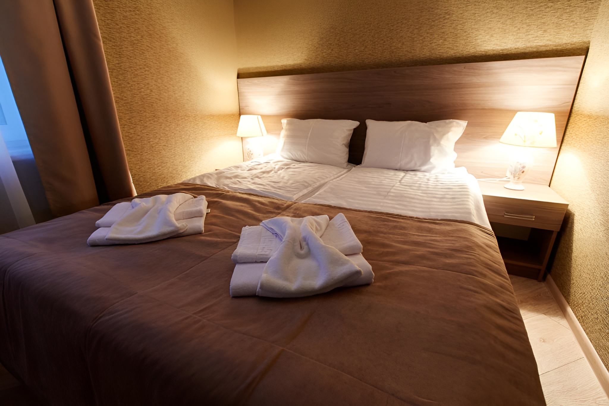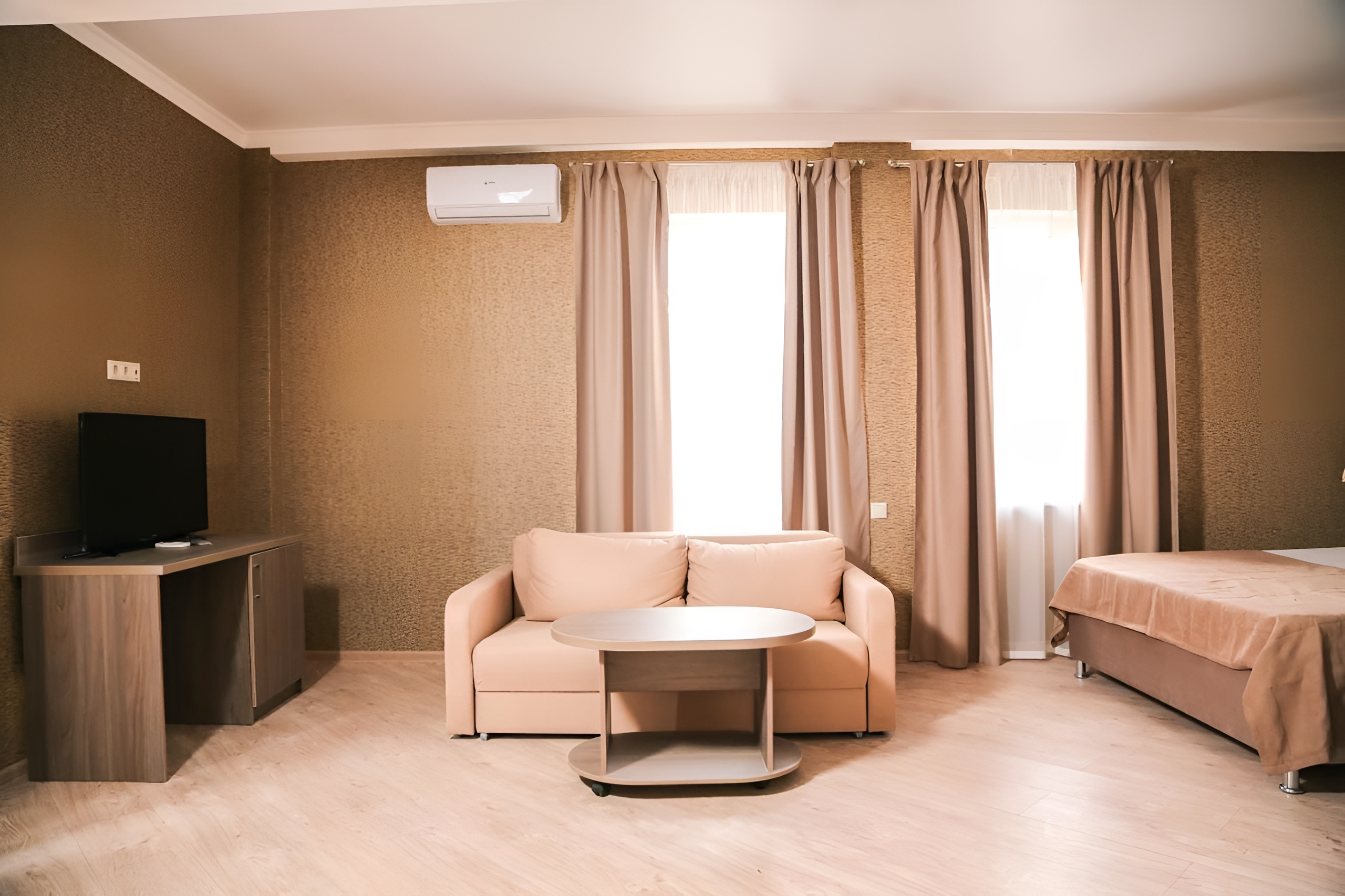 Отдыхали с подругой в этом отеле в июне 2024 года. Выбирали специально номер с раздельными кроватями, с собственным балконом. О номере было написано, что он улучшенный. Все улучшения коснулись только балкона, который конечно был огромный и своим боком выходил на море. Расположение номера 402 было сбоку отеля, одним углом к морю (если смотреть с моря на торец отеля, то наша номер и балкон были справа). 4-й этаж, лифта нет. Сразу при заезде нам отказали в раздельных кроватях, объяснив, что данный номер не предусматривает наличие раздельных кроватей, отдельный диванчик тоже ставить некуда. Т.е. номер такой же как и стандарт, улучшения касаются ТОЛЬКО балкона. А, простите, нам жить на балконе что ли?. Кровать была одна, двухспальная. Матрац на этой кровати пружинный, соответственно при любом повороте начинает колыхаться весь матрац и ваш сосед по кровати тоже. В номере нет ни одного стула, зато есть два пластиковых кресла на балконе. Номер был обеспечен чайником, который включить, кроме как у изголовья кровати, больше негде. Розетки сделаны очень высоко над столом, поэтому дотянуться провод от чайника просто не мог. Кровать расположена в узком закутке, пройти к кровати можно только боком. Дверь в номер запиралась с большим напрягом, как и в туалет с ванной. Ни та, ни другая не примыкали плотно к косяку. Да и двери, надо сказать, очень хлипкие. Надо отдать должное, что убирались каждый день, белье меняли раз в три дня. Иногда забывают положить пляжные полотенца. Сантехника в номере нормальная, все работает. Белье на кровати чистое. Очень маленькие подушки, приходилось подкладывать под них что либо. Есть кондиционер, повешен он сбоку над кроватью, поэтому при включении воздух циркулирует особенно сильно над одним из спящих. Утюг с гладильной доской есть на этаже, фен в номере имеется. Средства для принятия душа докладывали регулярно. Завтраки в кафе при отеле весьма странные. Каши варить не умеют от слова совсем, есть их в принципе невозможно. Выбрать себе что ты будешь есть нельзя. Набор примерно такой - каша, яичница, кофе (чай), десерт в виде запеканки. Выдаются все три блюда с разными вариациями (манная, рисовая, овсяная каша), яичница в разных интерпретациях с салатом. Разговаривали с соседями по отелю про ужины в ресторане - тоже сказали что кухня отвратительная. Выход на пляж через отель Лучезарный, пляж делят два отеля, лежаки и полотенца с зонтиками бесплатные. На пляже работает один сотрудник из стран ближнего зарубежья, которого не допросишься чтобы лежаки помог поставить ближе к морю. В целом вроде бы и ничего, но отель типа претендует на что-то большее, но явно уровнем не дотягивает. Улучшенный номер только за счет величины балкона - это как минимум странно. И не иметь возможности раздвинуть кровати для друзей - тоже. Лучше бы улучшали за счет удобств для гостей дополнительными спальными местами, чем огромным балконом. К тому же с нашей стороны очень сильно слышна музыка из кафешек напротив.
