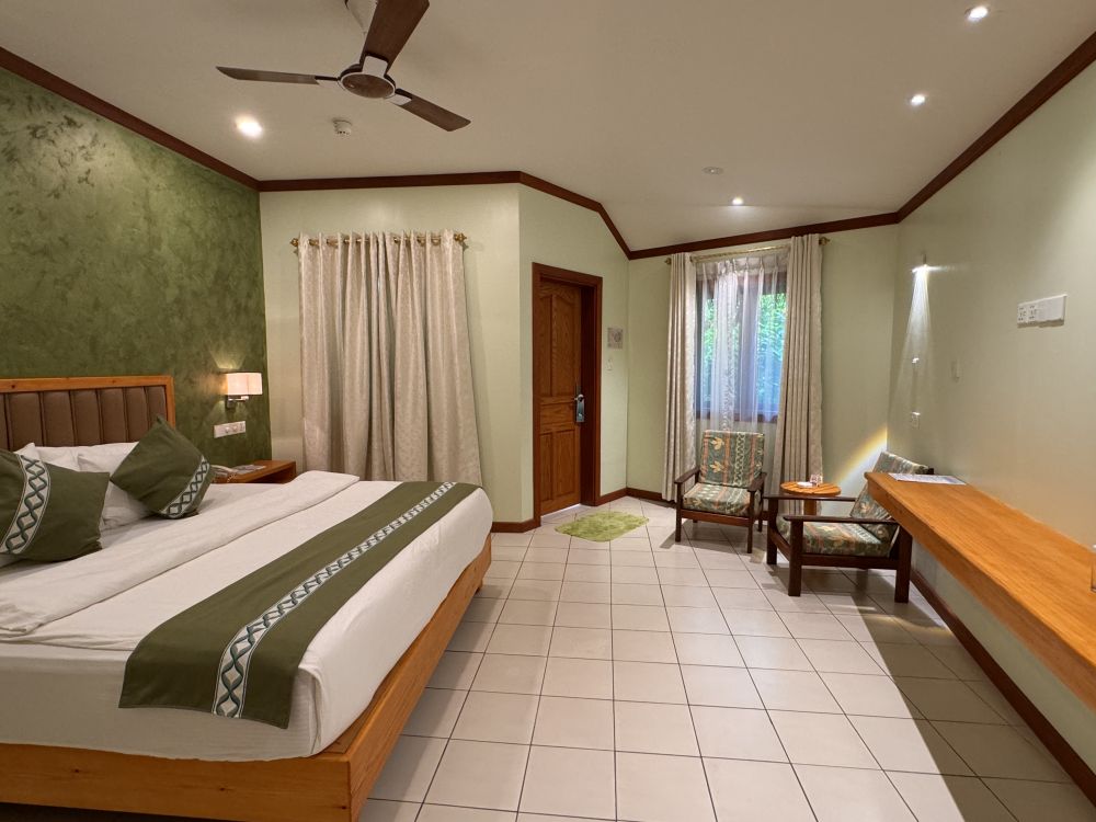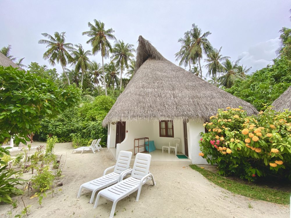 Мы были в первый раз на Мальдивах, к тому же не являемся избалованными туристами. Прибыли в отель около 8-30 утра, сразу нас заселили в номер и мы успели позавтракать. Номер оказался по расположению один из самых удачных на острове - 205, второй этаж (мы заказывали Deluxe Sky) правильно выбрали - люди мимо ходят очень близко к виллам. Номер для сорокалетнего отеля вполне достойный. Наше пребывание длилось 10 дней. Питание (у нас FB) очень вкусное, разнообразие не большое, но всегда на обед и ужин были блюда из курицы, рыбы, говядины, дважды ягненок, гарниры: паста двух видов, рис, картофель, много разных овощей, блюда каждый день разные, фрукты-яблоки, апельсины, ананас, папайя, дыня, арбуз, один раз манго, дважды маракуйя. Персонал очень профессиональный и доброжелательный, к тому же многочисленный, уборка в номере 2 раза в день, стол и официант закреплен за номером на весь период, обслуживание прекрасное никаких вопросов. Пляж - это то за чем мы ехали сюда - он невероятный со стороны нашей виллы: мелкий белый песочек, спокойная чистая вода, коралловый риф с множеством обитателей (маску брать обязательно, купить на месте тоже можно, но дорого). Советую взять с собой коралловые тапки, чтобы обследовать пляж и риф со всех сторон острова, дно с обломками кораллов, больно наступать, но рифы хотелось обследовать все, что тут есть. Тут стоит сказать, что мы любим разную живность и с удовольствием каждый день наблюдали за ящерицами, летучими лисицами, крабами, морскими обитателями, в т.ч. акулами (приплывали каждый вечер к пирсу). Погода: был не сезон, из 10 дней 5 было ясных, 4 дня короткие дожди и иногда пасмурно, 1 день дождь шёл целый день. Для меня это не было проблемой, переплачивать за отдых в высокий сезон не стала бы. Мы получили всё, на что рассчитывали и даже больше. Это было восхитительно! Спасибо отелю и всему персоналу за этот отдых, уже мечтаю снова вернуться туда и буду всем советовать.